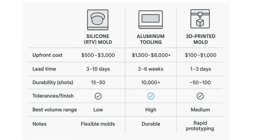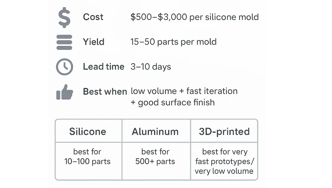 Pro Tip: If you’re uncertain, ask vendors to quote two paths: (1) silicone tooling for your first 30–50 units, and (2) aluminum tooling for the next 500+. The delta often clarifies the decision.